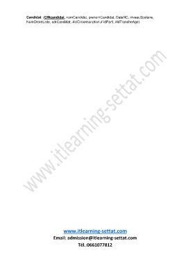 Candidat (CINcandidat, nomCandidat, prenomCandidat, DateNC, niveauScolaire, NumOrdreListe, adrCandidat, #idCirconscription,# idParti, #idTrancheAge) www.itlearning-settat.com Email: admission@itlearning-settat.com Tél.:0661077812