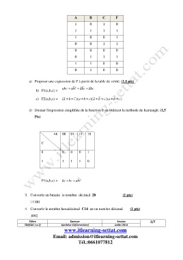 d) Donner l'expression simplifiée de la fonction F en utilisant la méthode de Karnaugh. (1,5