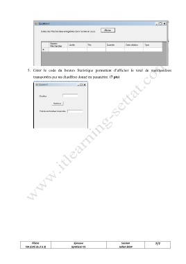 5. Créer le code du bouton Statistique permettant d’afficher le total de marchandises transportées par un chauffeur donné en paramètre. (7 pts) Filière Epreuve Session 7/7 TDI (CDS de 2 à 3) Synthèse V1 Juillet 2014